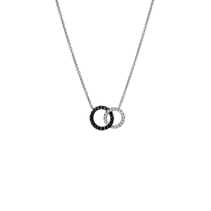 Petite Necklace BV1245 er en halskæde med to sammenflettede cirkler, hvor den ene cirkel har hvide, brillantslebne diamanter, imens den anden består af brillantslebne, sorte diamanter. Samlet vægt af sorte diamanter 0,07ct. Samlet vægt af hvide diamanter 0,04ct. Wesselton VS.